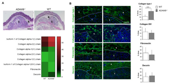 Differential expression of ECM proteins in the absence of ADAM9. (A) Analysis of ECM proteins at the tumor-stroma border. Black dotted lines indicate the microdissected areas used for mass spectrometry. t, tumor; s, stroma. Scale bar 50 µm. In the lower heatmap are the relative intensities of protein expression in ADAM9−/− and WT. (B) Immunofluorescence analysis of collagen type I, collagen type XIV, decorin, and fibronectin (green, nuclei: blue). As a negative control, sections were incubated in a blocking buffer without the primary antibody. Representative pictures are shown (WT n = 5; ADAM9−/− n = 5). Scale bar 400 µm. Staining was quantified in five different fields from 3 mice each genotype. Densities are shown as the percentage of the measured area; these are on the right. *** p < 0.0005.