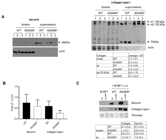 Increased synthesis of matrix components by stromal cells has been reported in several tumors, including skin cancer [22,23]. One of the suggested underlying mechanisms leading to the enhanced expression of matrix and its accumulation is the cellular communication of melanoma cells with the surrounding stroma [24]. That may lead to an altered turnover, thus modifications in protein synthesis and secretion, and altered proteolytical processing. To investigate the proteolytical role of fibroblasts-derived ADAM9 to matrix protein processing, we used monolayer cultures of fibroblasts. Synthesis and secretion of decorin and collagen type I was evaluated in control WT and ADAM9 deficient dermal fibroblasts grown as monoculture (Figure 2A). These experiments were performed using three independently isolated fibroblast populations from each genotype to ensure reproducibility. Decorin in the supernatants and cell lysates was detected as a low molecular weight form corresponding to decorin with approximately 40 kDa [25] (Figure 2). This product was observed in ADAM9−/− and control fibroblast supernatants. ADAM9 deficient fibroblasts compared to WT controls significantly increased expression of collagen type I (Figure 2 right panel). That was also detected when ADAM9 knockout fibroblasts were stimulated with B16F1 conditioned medium (B16F1 c.m.) as compared to fibroblasts WT cultures (Figure 2C). Interestingly, a low molecular weight collagen type I fragment of about 70 KDa was observed in both fibroblast supernatants and was reduced in ADAM9 deficient fibroblast supernatants (Figure 2A). Both decorin and collagen type I, were not detected in lysates and supernatants by B16F1 melanoma cells (Figure 2C). To identify whether the difference in ECM secretion by untreated fibroblasts was due to de novo synthesis, transcripts levels of decorin and collagen type I, were analyzed by real-time RT-PCR. The relative expression ratio of decorin transcripts in ADAM9−/− versus WT fibroblasts was not significantly changed in monocultures (Figure 2B). Comparable, relative transcript expression of collagen type I was higher, but not significant, in WT as compared to ADAM9−/− fibroblasts monolayer (Figure 2B).