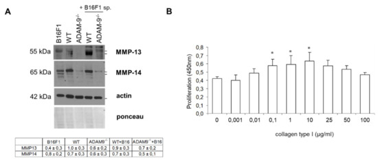 Deletion of ADAM9 leads to reduced expression of collagenolytic enzymes and thereby enhanced tumor cell proliferation. (A) MMP-13 and MMP-14 were analyzed by immunoblot in fibroblast supernatants (normalized to amounts of protein lysates) and lysates, respectively. Both ponceau staining of the membrane and actin immunoblot were used as the loading controls. Underneath, the quantification of MMP13 and 14 is shown (n = 5–9 independent fibroblasts isolation each genotype). (B) The proliferation of B16F1 melanoma cells was assessed in the presence of increasing concentrations of purified collagen type I by BrdU incorporation. The graph represents the mean ± SD. p values were calculated for cell proliferation in the presence of collagen type I compared to serum-free untreated control. * p < 0.05.