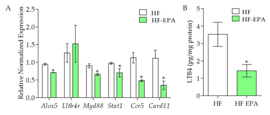 Validation of genes and LTB4 levels in adipose tissue from obese B6 mice. The expression of genes was validated by Q-PCR. (A) Gene expression of inflammatory markers Alox5, Ltb4r, Myd88, Stat1, Ccr5, and Card11; data are expressed as mean ± SEM, p ≤ 0.05, n = 6. (B) LTB4 levels in adipose tissue. Data are expressed as mean ± SEM, * p ≤ 0.05, n = 6; HF vs HF-EPA.