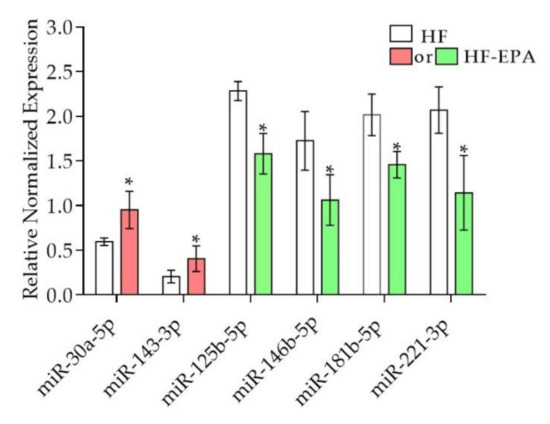 Validation miRNAs in adipose tissue of obese B6 mice using qPCR. The miRNA expression levels were validated. Validation of miR-30a-5p, miR-143-3p, miR-125b-5p, miR-146b-5p, miR-181b-5p, miR-221-3p; data are expressed as mean ± SEM, * p ≤ 0.05, n = 6; HF vs. HF-EPA. Red = upregulated; green = downregulated.