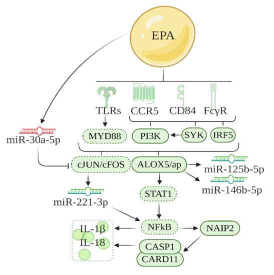 All the pathways downregulated by EPA are involved in inflammatory processes. Some genes appeared redundant among the pathways, such as Pik3-associated genes (Phosphoinositide-3-Kinase Regulatory Subunit 5—Pik3r5 and Phosphoinositide-3-Kinase Adaptor Protein 1—Pik3ap1), which appeared in five of the seven pathways (Table 1 and Table 3); inflammasome-related genes (Caspase 1—Casp1, Caspase Recruitment Domain Family Member 11—Card11, Naip2, and Pycard) appeared in four pathways (Table 1 and Table 3); Toll like receptors (Tlr1, Tlr6, Tlr7, Tlr8, and Tlr13) showed up in three pathways (Table 1 and Table 2); and Fc Fragment of IgG Receptor-related genes (Fcgr1a and Fcgr3a/b) were identified in two pathways (Table 1 and Table 2).