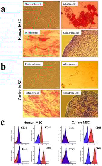The human and canine cells isolated and culture-expanded from adipose tissue fulfilled the criteria previously proposed by the International Society for Cellular Therapy (ISCT) to be considered MSCs []. These cell cultures consisted only of plastic-adherent cells with a fibroblastic appearance, which demonstrated the differentiation potential to form adipocytes, osteoblasts, and chondrocytes. After adipogenic induction, intracellular lipid droplet accumulation was confirmed by Oil Red O staining, whilst alkaline phosphatase activity was present when cells cultured in osteogenic induction medium, and the accumulation of glycosaminoglycans (GAGs) in the extracellular matrix of cell pellets were seen when cultured in chondrogenic induction medium, as indicated by toluidine blue staining (Figure 1a,b). Following analysis by flow cytometry, the human and canine cell cultures showed a lack of immunoreactivity for the hematopoietic CD markers, i.e., CD34 and CD45, while showing immunopositivity for the MSC-associated markers, i.e., CD44 and CD90, with each marker being detected in greater than 90% of all cell populations (Figure 1c).