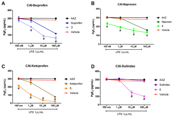 Effects of different concentrations of (A) CAI-ibuprofen, (B) CAI-naproxen, (C) CAI-ketoprofen and (D) CAI-sulindac on lipopolysaccharide (LPS)-induced prostaglandin E2 (PGE2) production in RAW 264.7 cells. The cells were pretreated with the studied compounds (100 nM, 1 µM, 10 µM and 100 µM) for 1 h, followed by LPS (1 μg/mL) stimulation for 18 h. PGE2 production analysis was carried out by using cell culture supernatants. PGE2 production of Control (naïve cells not treated with LPS) is 36.279 ± 0.67 pg/mL. Values represent the mean ± SEM of eight independent experiments (# p < 0.05 between a Nonsteroidal Anti-Inflammatory Drug (NSAID) and a Carbonic Anhydrase Inhibitor connected to a Nonsteroidal Anti-Inflammatory Drug (CAI-NSAID)).