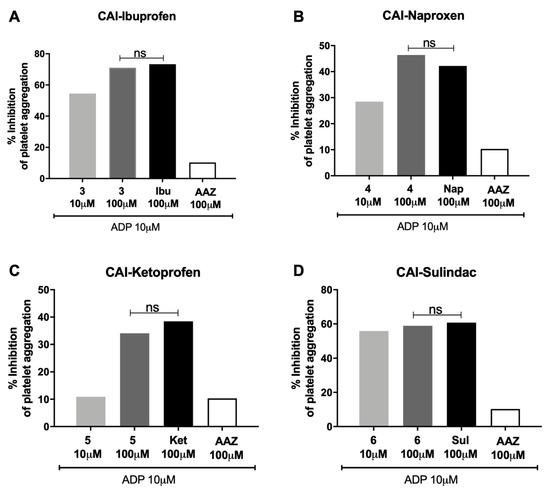 Percentage inhibition of platelet aggregation. Effects of different concentrations of (A) CAI-ibuprofen, (B) CAI-naproxen, (C) CAI-ketoprofen and (D) CAI-sulindac after 5 min of ADP (10 µM) incubation in human platelet-rich plasma (PRP). Platelet aggregation baseline is 79.37%, corresponding to 100% of aggregation. Values represent the mean ± SEM of 8 independent experiments, (ns = non-significant between selected columns).