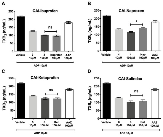 Thromboxane B2 production. Effects of different concentrations of (A) CAI-ibuprofen, (B) CAI-naproxen, (C) CAI-ketoprofen and (D) CAI-sulindac after 5 min of ADP (10 µM) incubation in human PRP. Values represent the mean ± SEM of eight independent experiments (* p < 0.05 between selected columns; ns = non-significant).
