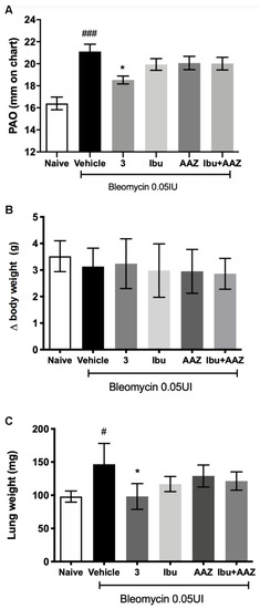 Our experiments were performed in C57BL/6 mice, which are more susceptible to bleomycin-induced fibrosis than other strains [35]; and the intra-tracheal delivery of bleomycin results in an intense inflammatory reaction within the first week, followed by the development of fibrosis by day 14, with maximal responses at day 21. Therefore, bleomycin administration caused a significant increase in airway stiffness, as judged by the elevation of pressure at airway opening (PAO) in the fibrotic positive controls (bleomycin+Vehicle) compared with the non-fibrotic negative ones (Naïve). The potency of compound 3 was compared with equimolar doses of (±)-ibuprofen and AAZ, given alone or in association, and the results of the present study clearly indicate that compound 3 has shown a sharp anti-inflammatory and anti-fibrotic action, in comparison to positive fibrotic controls (animals treated with Vehicle). The hybrid compound 3 had an increased effect in comparison to (±)-ibuprofen and AAZ given alone or in association.