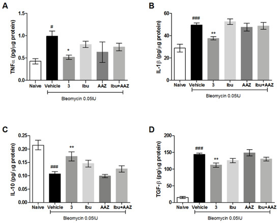 The late (21 days after challenge) inflammatory response to bleomycin was evaluated by measuring the cytokines IL-1β and TNF-α in the supernatant of lung homogenates. Bleomycin treatment increased IL-1β and TNF-α production in the lungs, while the systemic administration of the compound 3 significantly decreased the levels of IL-1β and TNF-α cytokine production. The treatment with (±)-ibuprofen and AAZ was not effective in the reduction of inflammatory cytokine production, as well as in their co-administration (Figure 7A,B).