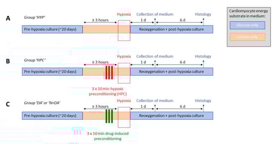 Study design and different hypoxia-reoxygenation experimental groups. (A) Hypoxia-reoxygenation alone (HYP) or (B) preceded by hypoxic preconditioning (HPC) or (C) preceded by drug-induced preconditioning (with [d-Ala2, d-Leu5]-Enkephalin (DADLE): DA, or Naloxone and DADLE: N+DA).