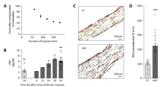 The long-term hypoxia and reoxygenation to induce tissue injury were performed inside the automated contractility measurement system (Figure S1). One of its components is a small incubator (volume 15.3 L) with a controllable gas inflow and a passive gas outflow. In the hypoxic periods, the gas composition was 93% N2 and 7% CO2.