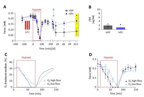 (A,B) Effect of hypoxic preconditioning (HPC, 3 × 10 min) followed by 90 min hypoxia compared to the hypoxic group without preconditioning (HYP). Data are presented as mean ± SEM. (A) Force (mN) before, during and after hypoxia in early (0–2 h) and late (≥2 days) reoxygenation. Two-way ANOVA and Sidak’s post-test at day 12 (yellow box, n = 10 per group, * p = 0.024). (B) Release of cardiac troponin I (cTnI) in the first 24 h (see arrow in A) after reoxygenation. Unpaired t-test (n = 6–7, * p = 0.031). (C,D) Impact of gas flow rates on the O2-fraction in the medium and on force. (C) O2-fraction measured in the medium during hypoxia experiments at high (5 L/min) or low gas flow (0.5 L/min) in the hypoxic chamber. The oxygen concentration inside the incubator (gas phases), as well as in the medium (5 mm below the surface, liquid phase), was determined with an oxygen microprobe based on fluorescent light emission (Microx-TX transmitter, tip diameter < 50 µm; Presens Precision Sensing GmbH, Regensburg, Germany). (D) Corresponding changes of the contractile force over time.