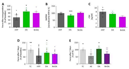 To explore drug-induced preconditioning, we used the δ-opioid receptor agonist [d-Ala2, d-Leu5]-enkephalin (DADLE). Again, we exposed rat EHTs to 90 min of hypoxia in lactate medium and reoxygenation in glucose medium (group “HYP”). This time the EHTs in the treatment group were incubated in lactate medium containing 100 nM DADLE (group “DA”) or 100 nM DADLE plus 10 µM naloxone (group “N+DA”) for three cycles of 10 min preconditioning. Contractile force recovered significantly better in the DA group than in the HYP group (Figure 4A). This effect was partly antagonized by naloxone. Accordingly, in the DA group G6PDH release was lower compared to the HYP group (Figure 4B). The cTnI analyses revealed no statistically significant differences between all groups (Figure 4C). The protective effect of DADLE preconditioning was maintained. Seven days after induction of hypoxia-reoxygenation injury the force in the DA group was lower than the time control without hypoxia, but significantly better than the hypoxic HYP group without conditioning (Figure 4D).