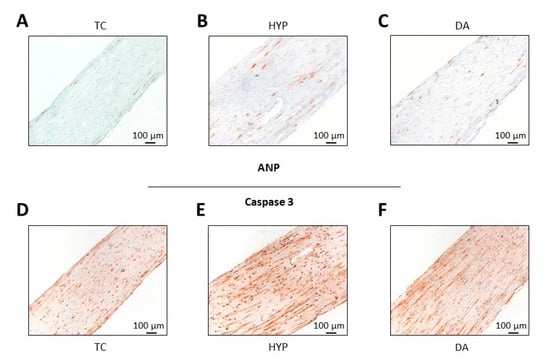 This was also reflected in representative micrographs of ANP- (Figure 5A–C) and Caspase 3-stained (Figure 5D–F) paraffin sections of the EHTs. Hypoxia led to an increase in ANP- and Caspase 3-positive cells accentuated in the central parts of the EHT (Figure 5B,E). The number of ANP-positive cells representing stressed cardiomyocytes and Caspase 3-positive (i.e., apoptotic) cells was lower when EHTs were preconditioned with DADLE (Figure 5C,F). To test if the protective long-term effect of DADLE also holds true for other types of cardiac stress, we performed a strong increase in afterload of EHTs [13]. DADLE fully prevented the afterload-induced decline in force. This effect was partly reversed by the addition of the opioid receptor antagonist naloxone (Figure 4E).