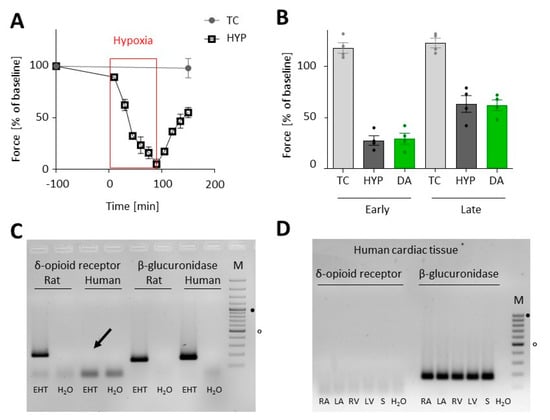 Lastly, the implemented treatment protocol was adapted from rat to human EHTs (Supplementary Materials, Video S1). We exposed human EHTs to 90 min of hypoxia in lactate medium. All culture and preconditioning steps before were identical to those described for rat EHTs. Likewise, 90 min of hypoxia and reoxygenation led to a comparable reduction in force in human, as in rat, EHTs (Figure 6A). However, in contrast to rat EHTs, no better recovery after DADLE preconditioning could be observed in neither early nor late reoxygenation (Figure 6B). PCR analysis revealed that the δ-opioid receptor was not detectable in human EHT tissue (Figure 6C), as well as in human atrial, septal, and ventricular tissue samples (Figure 6D).