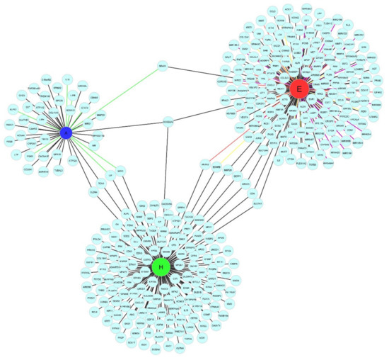 - Shannon, P.; Markiel, A.; Ozier, O.; Baliga, N.S.; Wang, J.T.; Ramage, D.; Amin, N.; Schwikowski, B.; Ideker, T. Cytoscape: A Software Environment for Integrated Models of Biomolecular Interaction Networks. Genome Res. 2003, 13, 2498–2504. [Google Scholar] [CrossRef] [PubMed]