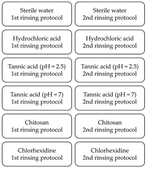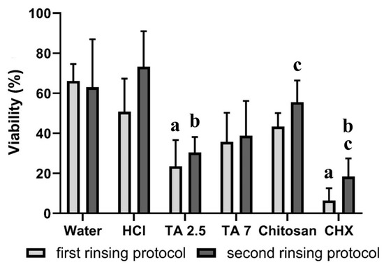 In the first rinsing protocol, rinsing with water or a hydrochloric acid solution resulted in a viability of 51–66% (Figure 5). For tannic acid (pH = 7) or chitosan, the viability was 35–43%, while tannic acid (pH = 2.5) or chlorhexidine reduced the viability significantly (p < 0.05) to 6–23%. In the second rinsing protocol, after the application of water, hydrochloric acid solution or chitosan, the viability was 56–73%. For tannic acid (pH = 2.5), the viability was reduced significantly (p < 0.05) to 30%, and rinsing with tannic acid (pH = 7) resulted in a viability of 39%. Chlorhexidine was able to reduce the viability significantly (p < 0.05) to 18%. The differences between both rinsing protocols were only significant for chlorhexidine (p < 0.05).