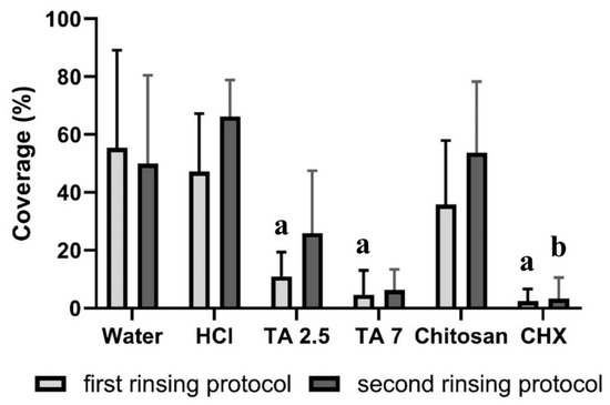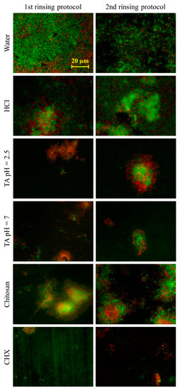 In the first rinsing protocol, rinsing with water or hydrochloric acid solution resulted in a coverage of 47–55% (Figure 3). Rinsing with chitosan reduced the coverage to 36%, while rinsing with tannic acid (pH = 2.5), tannic acid (pH = 7) or chlorhexidine reduced the coverage significantly (p < 0.05) to 2–11%. In the second rinsing protocol, after the application of water, hydrochloric acid solution or chitosan, the coverage was 50–66%. Rinsing with tannic acid (pH = 2.5), tannic acid (pH = 7) or chlorhexidine resulted in a coverage of 3–26%. In the second rinsing protocol, only chlorhexidine was able to reduce the coverage significantly (p < 0.05). Representative fluorescence micrographs are depicted in Figure 4. Differences between both rinsing protocols are not significant (p > 0.05).