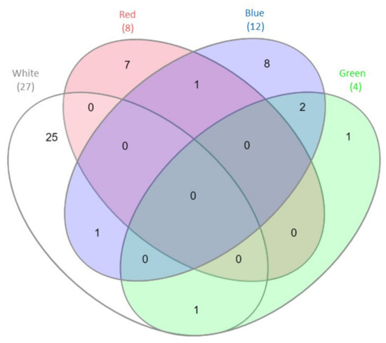 Venn diagram [29] demonstrating the number of differentially expressed genes (DEGs) engaged in proteolytic processes detected during C. unicolor growth in white light (light grey), green light (green), red light (red), blue light (blue) vs. dark conditions. The numbers of DEGs common/unique for the white, red, blue and green vs. dark conditions are indicated.