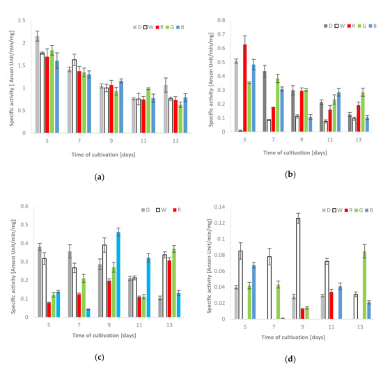 Total activities of acid [(a)–extra-and (b)–intracellular] and alkaline proteases [(c)–extra-and(d)–intracellular] using hemoglobin as a reaction substrate detected during C. unicolor growth in the dark (D), white (W), red (R), green (G) and blue light (B) conditions.