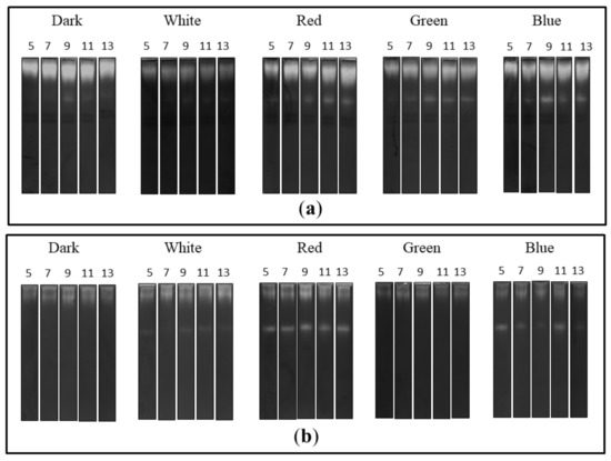The zymographic analysis of the extra- and intracellular fungal extracts showed the presence of bands indicating proteolytic activity in all tested preparations in acidic conditions (Figure 3). A clear increase in the gelatine digestion rate was observed in the case of the extracellular extracts obtained from fungal cultures growing in the red, green and blue light conditions. There was a characteristic appearance of additional rapidly migrating bands corresponding to protease activity, whose intensity increased markedly during the experimental period. Moreover, the intensity of bands indicating extracellular proteolytic activity of C. unicolor grown in white light was the lowest in relation to the other lighting variants, including the control (Figure 3a). Additional bands of proteolytic activity were also detected by native PAGE in samples of intracellular extracts prepared from the fungus cultured in the red and blue light conditions. The intensity of bands showing proteolytic digestion of the substrate was lower in the white light variant than in the case of the red and blue C. unicolor cultivation conditions; however, an additional activity band was detected in all these cases. Surprisingly, no fast migrating proteolytic bands were detected in the intracellular extract of the fungus cultivated in the green light conditions. The most intense activity bands throughout the entire experimental period were detected in the red light variant. In contrast, the lowest proteolytic activities in the tested intracellular samples were recorded in the darkness and green light conditions (Figure 3b).