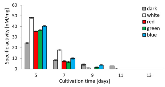 The chymotrypsin-like activity (CHT-L) of the 26S proteasomes isolated from the mycelia of C. unicolor measured against the fluorogenic Suc-LLVY-AMC substrate was light-dependent as well. All lighting conditions stimulated the chymotrypsin-like activity of C. unicolor proteasomes, especially on the 5th and 7th day of the cultivation period, where the highest proteasomal activity (48.3 and 17.9 nM/mg, respectively) was detected in the white light conditions. In contrast, the lowest stimulation of the CHT-L activity of C. unicolor proteasomes was recorded in darkness throughout the entire period of cultivation. The highest CHT-L activities in the red, blue and green light conditions were measured on the 5th day of fungus growth and they reached 35.3, 40.3 and 36.4 nM/mg of protein, respectively. A decrease in the C. unicolor proteasomal activity over the cultivation time was observed and no CHT-L activity was detected in all lighting variants on the 13th day (Figure 4).