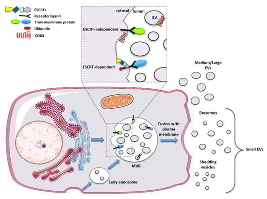 The discovery of EVs dates back to more than 50 years ago when Chargaff and West, in 1946, observed the presence of procoagulant platelet-derived particles [31], called later “platelet dust” by Wolf in 1967 [32]. In 1983, Harding and colleagues demonstrated the existence inside rat reticulocytes of multivesicular endosomes that fused back with the plasma membrane to release their vesicular content [33]. These particular vesicles were also obtained in the same year by Pan and Johnson after 1h of 100,000× g ultracentrifugation, starting from sheep reticulocytes-derived supernatants [34]. Historically, larger attention has been posed on exosomes, small vesicles with a size ranging between 30–150 nm. Exosomes are produced by the inward budding of the endosomal compartment, thus forming the so-called “multivesicular body” (MVB). These intraluminal vesicles are subsequently released outside the cell after the fusion of the MVB with the plasma membrane. These released exosomes, which correspond to the vesicles observed by Harding in 1983 [33], once outside the producer cell, can be engulfed by adjacent, as well as by distant target cells [35].