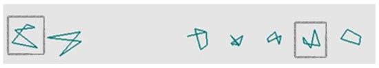 - Cognitive processing speed: In this test, subjects solved a symbol search paradigm known to be a valid measure of cognitive processing speed in healthy older adults [18]. The assignment was time-limited and lasted five minutes. For each trial, two target symbols were presented on the left side of the paper. The subjects had to decide whether one of the two targets appeared in a series of five shapes on the right (shapes could reappear on the right in different sizes and/or different orientations) (see Figure 1). The score for this test is the sum of the correct responses.