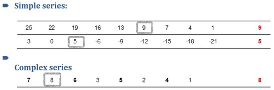 Figure 3. An example of two simple series and one complex series. Grey frames and the answers in red on the right side were added for illustration purposes.