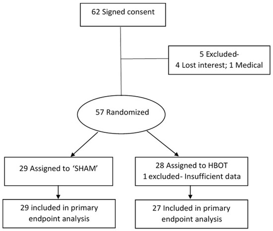 Sixty-two subjects signed the informed consent form and were randomized to either study group. Out of the 62, 5 did not perform an in-chamber test and were excluded: 1 had intercurrent disease that prevented him from going into the chamber and 4 lost interest after the training session. Another subject did not complete the tests in the chamber. Accordingly, 56 individuals were included in the final analyses, 27 subjects in the HBOT group and 29 in the sham group (see Figure 4).