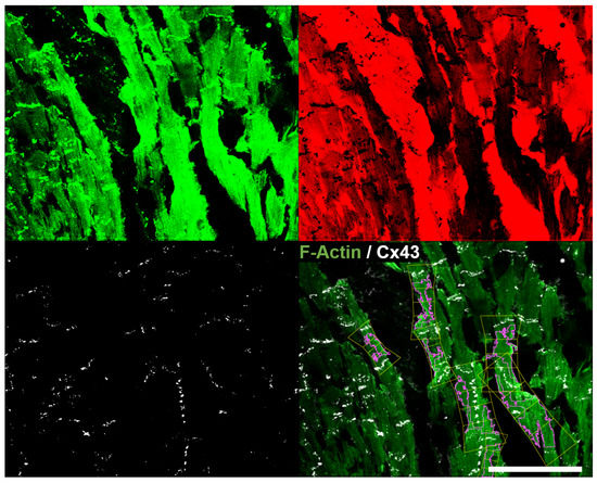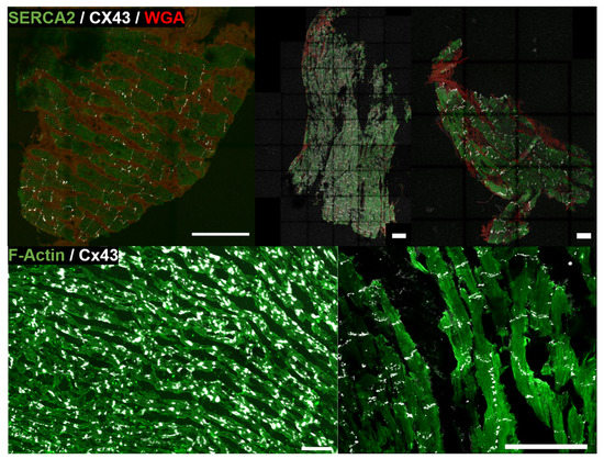 Top: (SERCA2) and (WGA) binarized channels. Bottom left: (CX43) binarized channel. Bottom right: merged channel. Scale bar = 100 m.