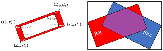Left panel: representation of vertex projection from original coordinates () to extended coordinates (). Right panel: illustration of how the intersection between cardiomyocytes (CMs) in the manual and automatic masks was computed. The red box shows the enclosing rectangle for a CM in the automatic mask , whereas the blue box shows the enclosing rectangle for a CM in the manual mask . The purple area is the intersection between the areas of the two rectangles: .