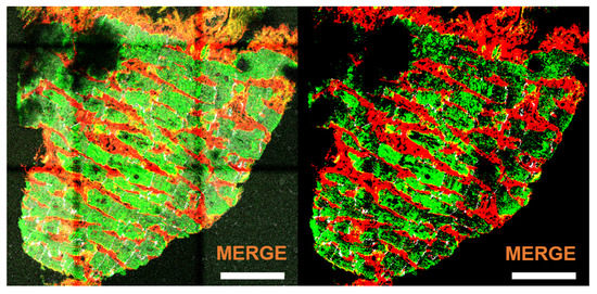 Merged channels for image a before (left) and after (right) noise removal. Scale bar = 100 m.