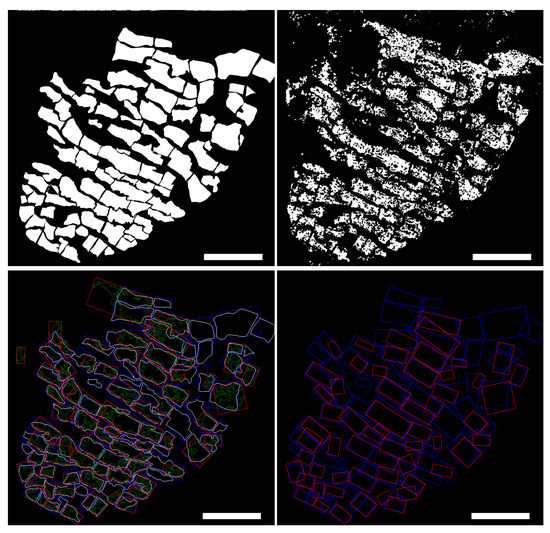 Examples of four detected CMs from automatic masks obtained for images (top) and (bottom). Morphological measurements and values are provided in Table 3 for (top left), (top right), (bottom left) and (bottom right). Scale bar = 20 m.