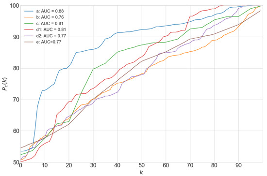 Once was obtained for all CMs in , the corresponding percentile curve was computed for each k-th integer percentile from 1 to 100. To compute AUC, was integrated numerically using the trapezoidal rule:
