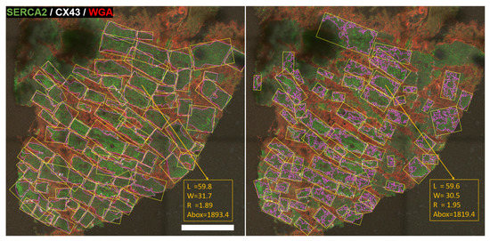 CMs in the manual (left) and automatic (right) masks contoured in pink, with enclosing rectangles in yellow. At the bottom right corner of each panel is an example of morphological measures computed for a CM detected in both masks. Scale bar = 100 m.