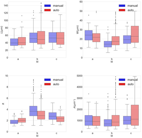 In Figure 9, box plots showing statistical results for L, W, R and A are shown for images a, b and c. As it can be appreciated from the figure, the statistical measures for all morphological markers obtained by the automatic algorithm are in line with those measured manually. The interquartile ranges for L in and span from 20 to 120 m, while those for W span from 5 to 50 m. This translates into interquartile ranges for R covering from 1 to 7.