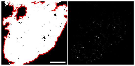 Left: Tissue mask represented in white, enclosed by maximum contour in red, for image a. Right: Equalized and binarized channel () for the same image. Scale bar = 100 m.