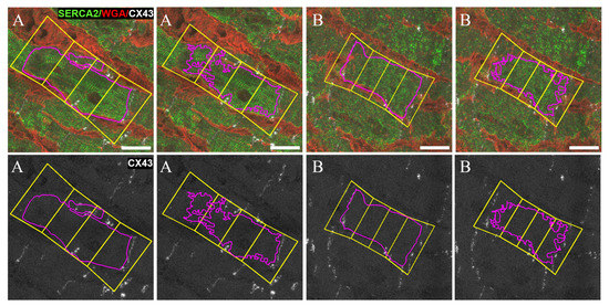 Examples of two different CMs (A and B) that were box partitioned for quantification by both manual and automatic methods (Figure 11). CM A presents an extremely high lateral-to-total CX43 ratio ( = 79.4%, in ) while the result in is similar for the same CM ( = 73.9%). On the other hand, CM B has a lateral-to-total CX43 ratio close to the global average, being 24.4% for and = 23.0% for .