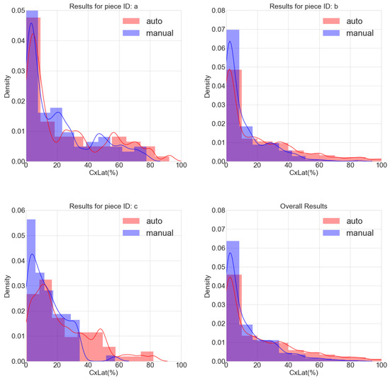 Histograms and density plots for computed for images a (top left), b (top right) and c (bottom left), as well as for pooled data from the three images (bottom right), both from automatic (red) and manual (blue) CM masks.