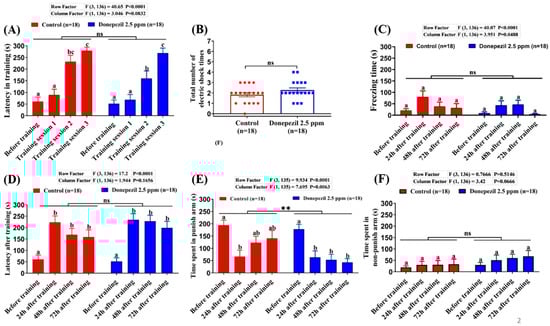 Figure 1. T-maze conditioning passive avoidance to test short-term memory of fish after 21 days exposure to 2.5 ppm of donepezil: (A) the latency of control and donepezil-exposed fish swimming into the punish chamber for each training session; (B) the total number of electric shocks given for successful training between control and donepezil-exposed fish; (C) the freezing time of control and donepezil-exposed fish at different time points before and after training; (D) the memory retention of control and donepezil-exposed fish at different time points before and after training; (E) the time spent in punish arm of control and donepezil-exposed fish at different time points before and after training; (F) the time spent in the non-punish area of control and donepezil-exposed fish at different time points before and after training. The data are expressed as the mean ± standard error of the mean (SEM) values. Different letters (a, b, c) on the error bars represent the significant differences (p < 0.05); A and C–F were analyzed by two-way ANOVA with Tukey-HSD (Honestly Significant Difference) post hoc test; B was analyzed by unpaired t-test; n = 18, ** p < 0.01.