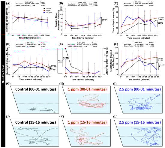 Figure 2. Behavior endpoints of control and donepezil-exposed zebrafish in novel tank test after 14 days of incubation: (A) average speed; (B) freezing time movement ratio; (C) time in top duration; (D) number of entries to the top; (E) latency to enter the top; and (F) total distance traveled in the top were analyzed. The swimming trajectories of (G,J) control; (H,K) 1 ppm Donepezil-exposed fish; and (I,L) 2.5 ppm Donepezil-exposed fish for novel tank test after 1 min and 15 min were recorded and compared. The black line represents control and the red line represented 1 ppm Donepezil-exposed fish, while the blue line represents 2.5 ppm Donepezil-exposed fish. The data are expressed as the median with interquartile range and were analyzed using a two-way repeated measure ANOVA with Geisser–Greenhouse correction. To observe the main column (donepezil) effect, Dunnett’s multiple comparison test was carried out; n = 30, * p < 0.05, ** p < 0.01, *** p < 0.005, **** p < 0.001.