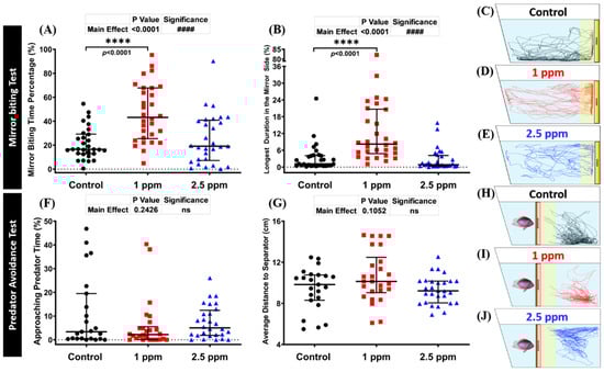 Figure 3. Mirror biting and predator avoidance behavior endpoint comparisons between the control, 1 ppm, and 2.5 ppm donepezil-exposed zebrafish groups after 14 days of exposure: (A) mirror biting time percentage and (B) longest duration in the mirror side were analyzed in the mirror biting. The swimming trajectories of (C) control, (D) 1 ppm Donepezil-exposed fish, and (E) 2.5 ppm Donepezil-exposed fish for the mirror biting test were recorded and compared (n = 30 for control and 1 ppm groups, n = 29 for 2.5 ppm group). (F) Approaching predator time and (G) average distance to the separator were measured in the predator avoidance test. The swimming trajectories of (H) control, (I) 1 ppm Donepezil-exposed fish, and (J) 2.5 ppm Donepezil-exposed fish for predator avoidance test were recorded and compared (n = 23 for the control group, n = 26 for 1 ppm group, n = 28 for 2.5 ppm group). The data are expressed as the median with interquartile range and were analyzed using the Kruskal–Wallis test followed by Dunn’s multiple comparisons test (####/**** p < 0.001, ns = not significant).
