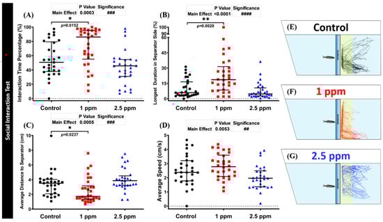 Figure 4. Social interaction behavior endpoint comparisons between the control group, 1 ppm, and 2.5 ppm donepezil-exposed zebrafish groups after 14 days of exposure: (A) interaction time percentage; (B) longest duration at separator side; (C) average distance to the separator; and (D) average speed were analyzed. The swimming trajectories of (E) control, (F) 1 ppm Donepezil-exposed fish, and (G) 2.5 ppm Donepezil-exposed fish for social interaction tests were recorded and compared. The data are expressed as the median with interquartile range and were analyzed using the Kruskal–Wallis test followed by Dunn’s multiple comparisons test (n = 29 for control and 2.5 ppm groups, n = 30 for 1 ppm group, * p < 0.05, ##/** p < 0.01, ### p < 0.001, #### p < 0.0001).