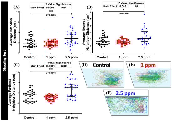 Figure 5. Shoaling behavior endpoint comparisons between the control group, 1 ppm, and 2.5 ppm donepezil-exposed zebrafish groups after 14 days of exposure: (A) average inter-fish distance; (B) average nearest neighbor distance; and (C) average farthest neighbor distance were analyzed. The swimming trajectories of (D) control, (E) 1 ppm Donepezil-exposed fish, and (F) 2.5 ppm Donepezil-exposed fish for shoaling tests were recorded and compared. Groups of three fish were tested for shoaling behavior. The data are expressed as the median with interquartile range and were analyzed using the Kruskal–Wallis test followed by Dunn’s multiple comparisons test (n = 30, * p < 0.05, ##/** p < 0.01, ### p < 0.001, #### p < 0.0001).