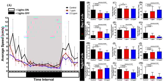 Figure 6. Evaluation of the circadian locomotor activity for control and chronic donepezil-exposed fish: (A) Circadian patterns of average speed; (B) average speed; (C) average angular velocity; (D) meandering; (E) freezing movement time ratio; (F) swimming movement time ratio; and (G) rapid movement ratio during the light cycle. (H) Average speed; (I) average angular velocity; (J) meandering; (K) freezing movement time ratio; (L) swimming movement time ratio; and (M) rapid movement ratio during the dark cycle. The data are expressed as the median with interquartile range and were analyzed using Kruskal–Wallis test followed by Dunn’s multiple comparisons test (n control fish = 18; n donepezil-treated fish = 18; * p < 0.05, ** p < 0.01, *** p < 0.001, **** p < 0.0001).