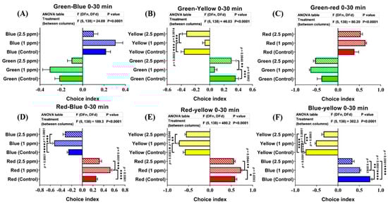 Figure 7. Comparison of the color preference behavior between control and donepezil-exposed fish after 17 days of donepezil exposure. The combinations of four colors were: (A) the green/blue test, (B) green/yellow test, (C) green/red test, (D) red/blue test, (E) red/yellow test, and (F) blue/yellow test. The data are expressed as the mean ± SEM values and were analyzed by two-way ANOVA (n = 24; * p < 0.05, ** p < 0.01, *** p < 0.001, and **** p < 0.0001).