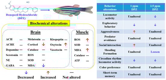 Figure 8. Summary of biochemical and behavioral changes in adult zebrafish after acute or chronic exposure to Donepezil. The behavioral alterations are summarized in the right panel and the biochemical alterations in brain and muscle tissues are summarized in the left panel.