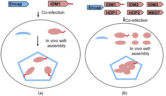 Schematic representation of heterologous cargo-loaded encapsulin expression in insect cells. Diagrams of in vivo encapsulin assembly resulted from the coexpression of Encap and cargo proteins in the baculovirus expression system with IDM1 as cargo alone (a) and the IDM holo complex as cargo (b).