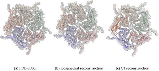 - Zheng, S.Q.; Palovcak, E.; Armache, J.-P.; Verba, K.A.; Cheng, Y.; Agard, D.A. MotionCor2: Anisotropic correction of beam-induced motion for improved cryo-electron microscopy. Nat. Methods 2017, 14, 331–332. [Google Scholar] [CrossRef]