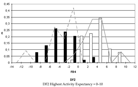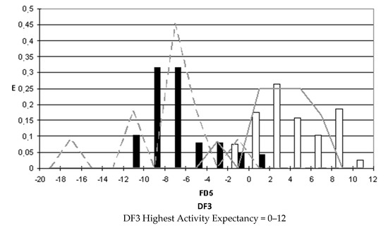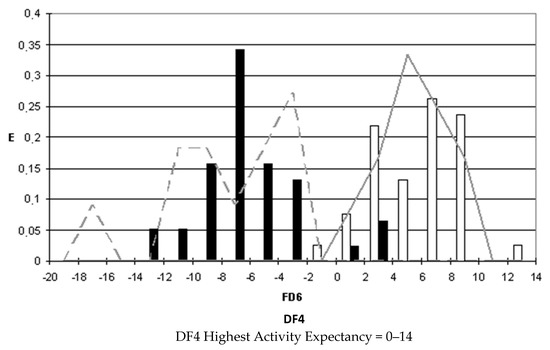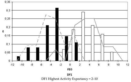 After selecting the discriminant function, the corresponding pharmacological distribution diagrams (PDD) were built up. These plots are useful to determine the intervals of the discriminant function in which the expectancy, E, to find active compounds is maximum. PDDs are histogram-like plots of connectivity functions in which the expectancies appear on the ordinate axis. For an arbitrary interval of values of a given function, we can define the expectancy of activity as Ea = a/(i + 1), where “a” is the number of active compounds in the interval divided by the total number of active compounds, and “i” is the number of inactive compounds. The expectancy of inactivity is defined in a symmetrical way, as Ei = i/(a + 1). This representation provides good visualization of the regions of minimum overlap and selects regions in which the probability of finding improved compounds is maximum [18].